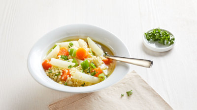 Vegetarische Tomatensuppe mit NudelnKann auch mit Dinkelreis, Bulgur oder anderen Getreide angeboten werden.
